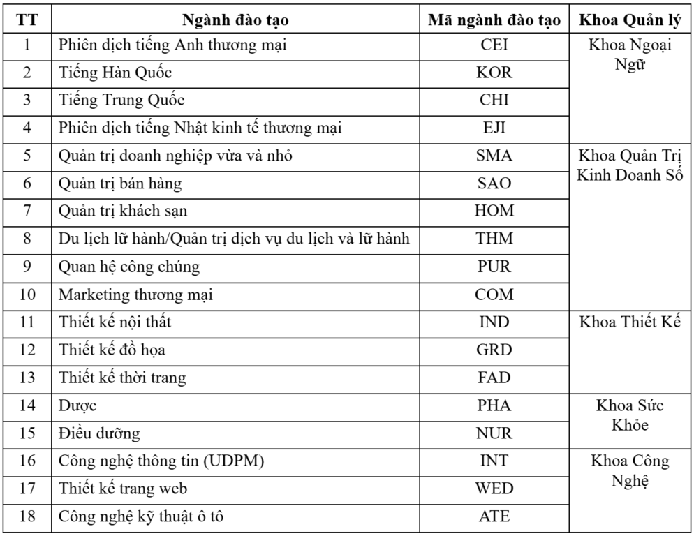 Phụ huynh và Tân sinh viên xem mã ngành học theo bảng sau: